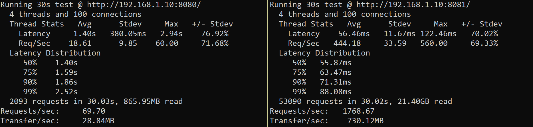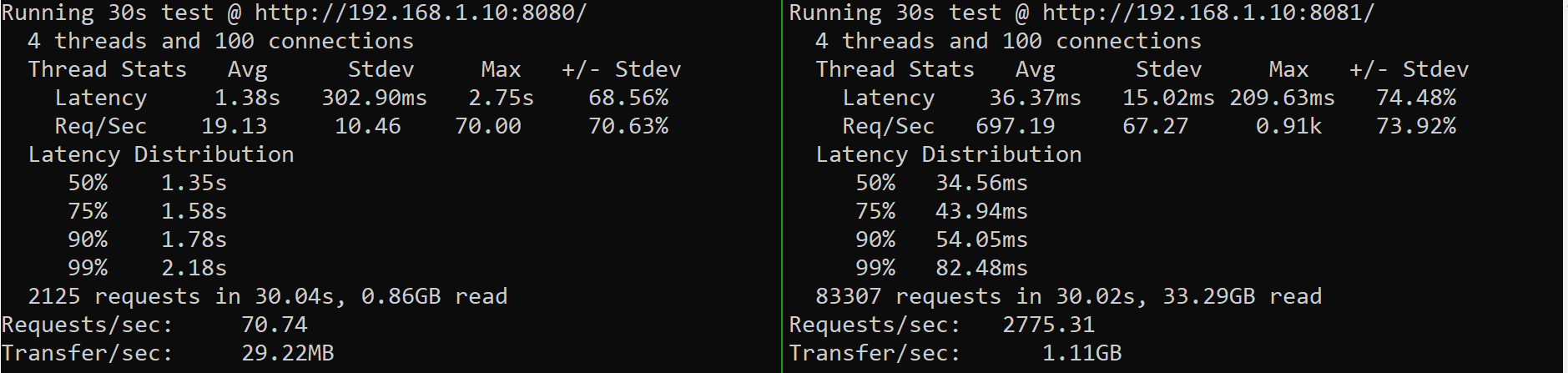 De eerste testresultaten waren overduidelijk: Prexy was ongeveer 22 keer zo snel in het behandelen van één request (zie de afbeelding hieronder). Dit gaf het project definitief groen licht, omdat er met zo'n groot verschil genoeg ruimte was om wat performance degradaties te incasseren die zich eventueel voor zouden doen met het volledig maken van de functionaliteit.